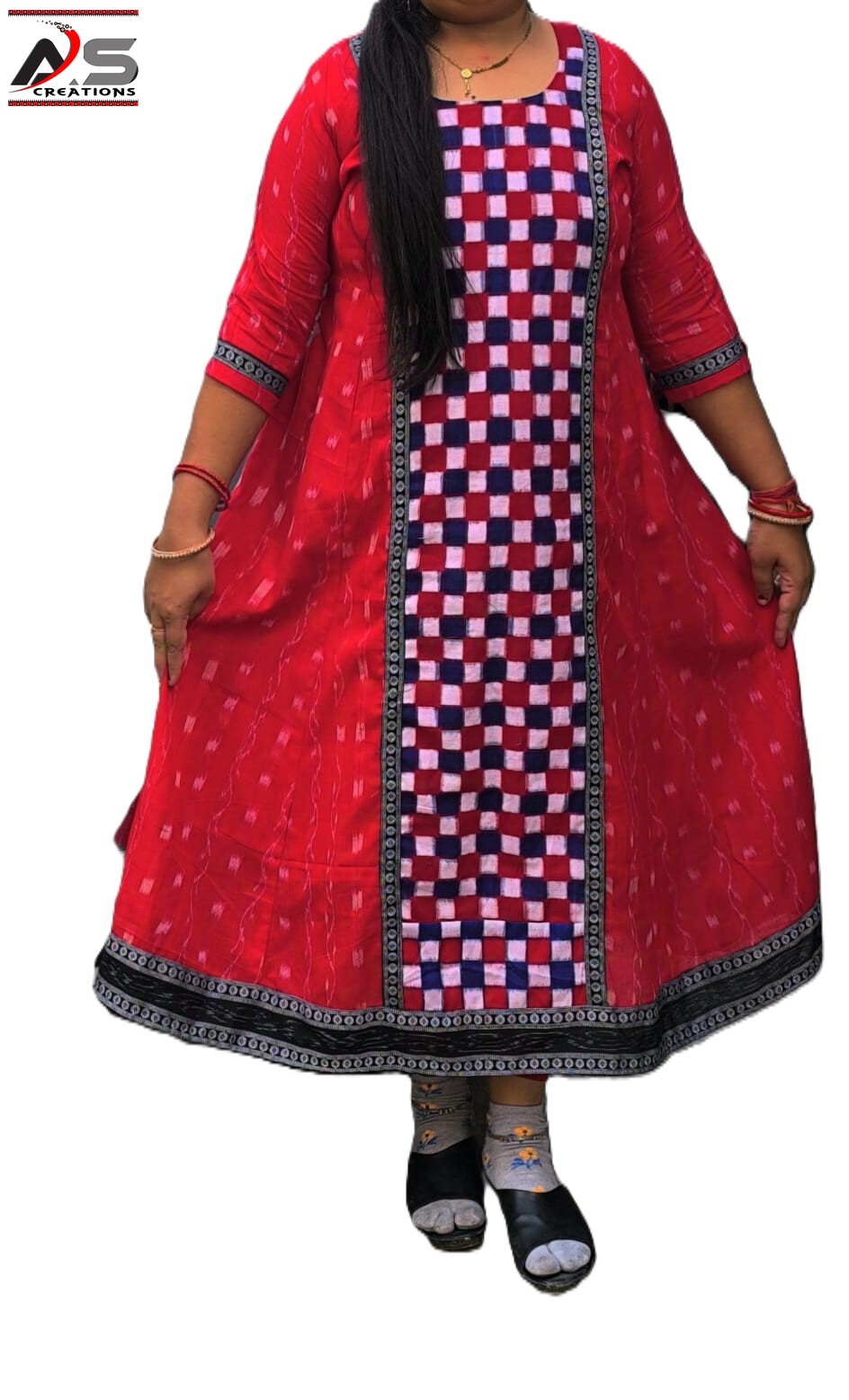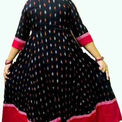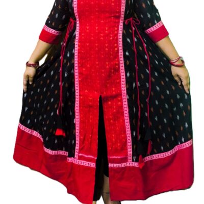 Pure Sambalpuri Handloom Cotton Middle-Cut Gown – Red & Black, Regular Fit