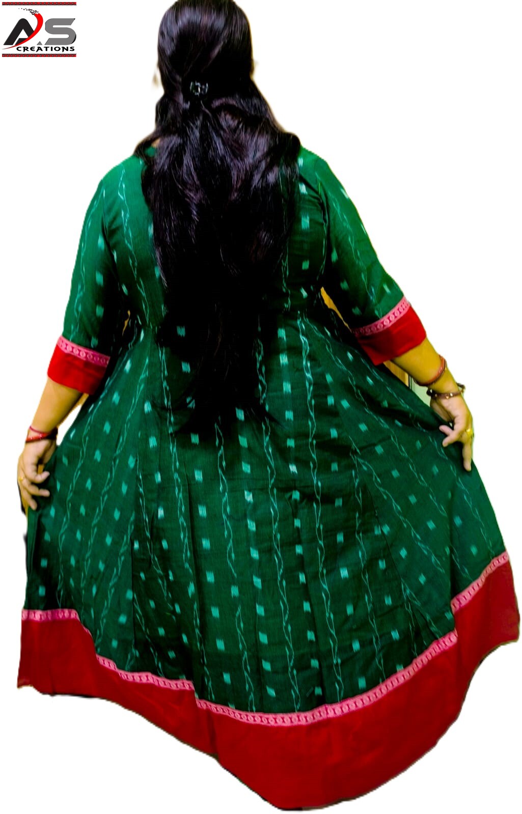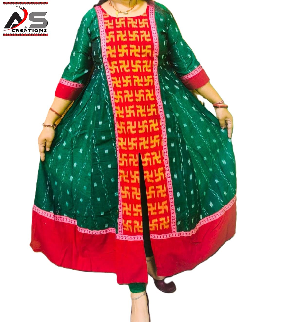 PURE SAMBALPURI HAMDLOOM GOWN COTTON MIDDLE CUTT GOWN-Dark Green & Red, Regular Fit
