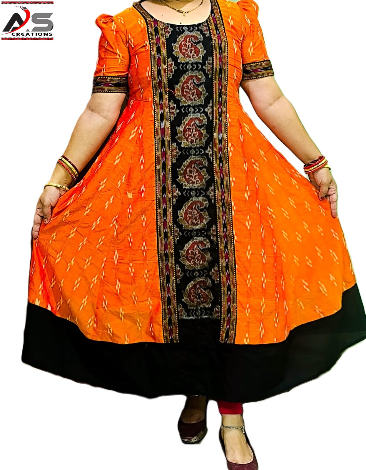 Refresh your ethnic collection with this pure Sambalpuri handloom frock gown crafted from premium cotton fabric. Designed for comfort and elegance, it features a flowing frock silhouette with 1/3rd sleeves in a vibrant orange and black color combination.