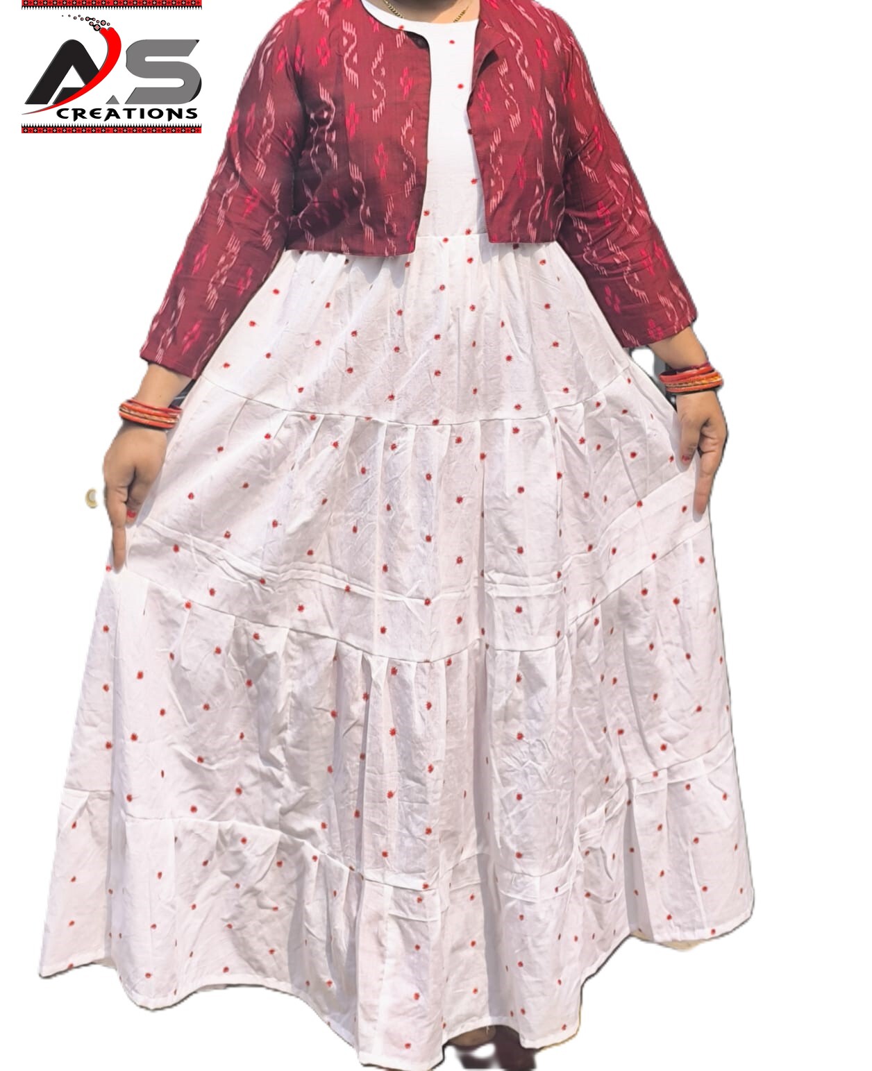 Add a refined ethnic touch to your wardrobe with this pure Sambalpuri handloom jacket-style gown. Crafted from breathable cotton fabric, it features a layered jacket silhouette with 1/3rd sleeves in an elegant white and brown color combination.
