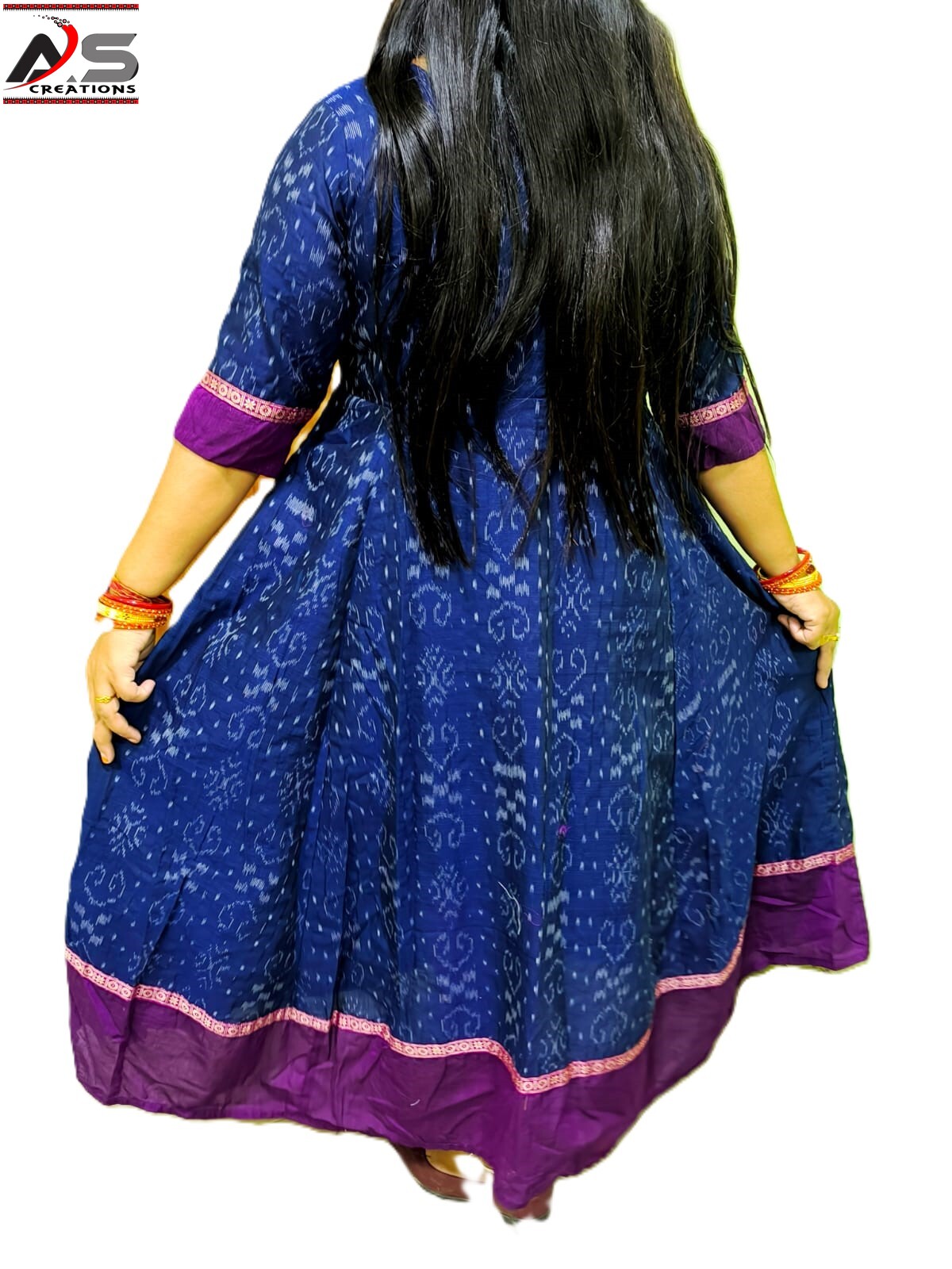 Enhance your ethnic collection with this pure Sambalpuri handloom middle-cut gown crafted from premium cotton fabric. Designed for elegance and comfort, it features 1/3rd sleeves and a rich blue and maroon color combination.