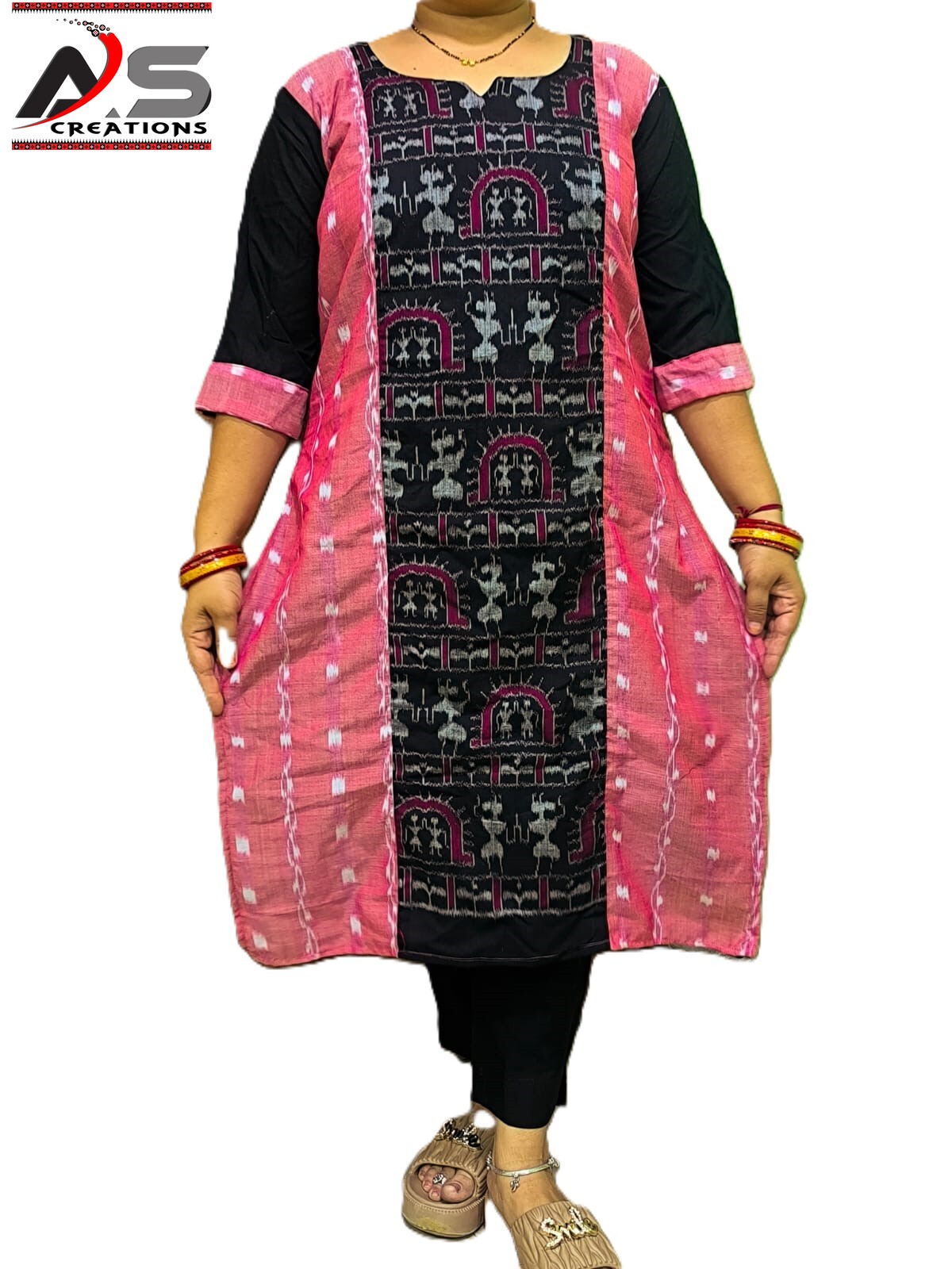 Add a soft yet striking look to your ethnic wardrobe with this pure Sambalpuri handloom straight kurti. Crafted from breathable cotton fabric, it features a clean straight silhouette with 1/3rd sleeves in an elegant baby pink and black color combination.